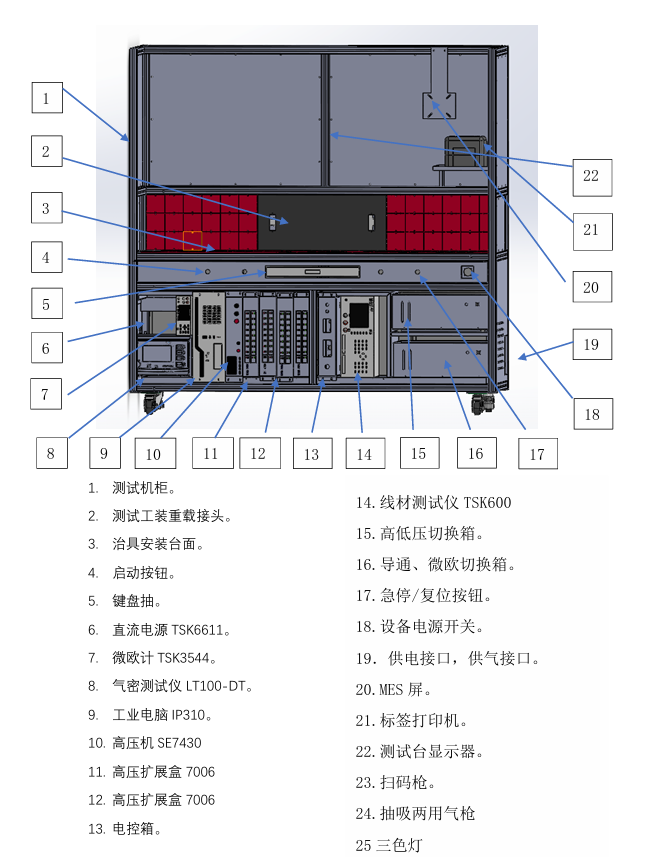 TSK2000 综合检测台是我们公司专门针对高压线束和充电座线束开发的一款综合检测设备,集电测、温控电阻、电子锁、灯语及气密一体的多功能综合检测设备,设备集成度高,使用更方便;目前使用的客户群有:中航光电、沃尔核材、智绿环保、广州知崇、宁波均胜、华星动力等等。