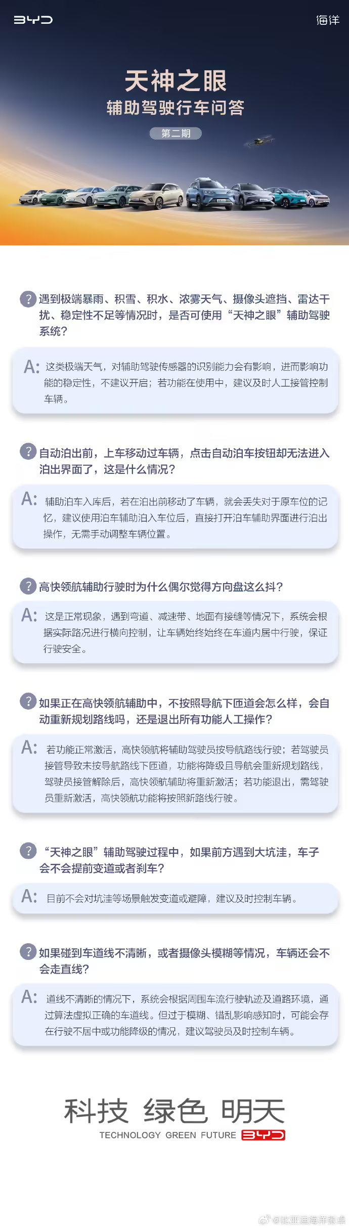 IT之家 8 月 24 日消息,比亚迪昨日发布天神之眼智能辅助驾驶行车问答第二期,针对用户行车中遇到过的问题进行解答。